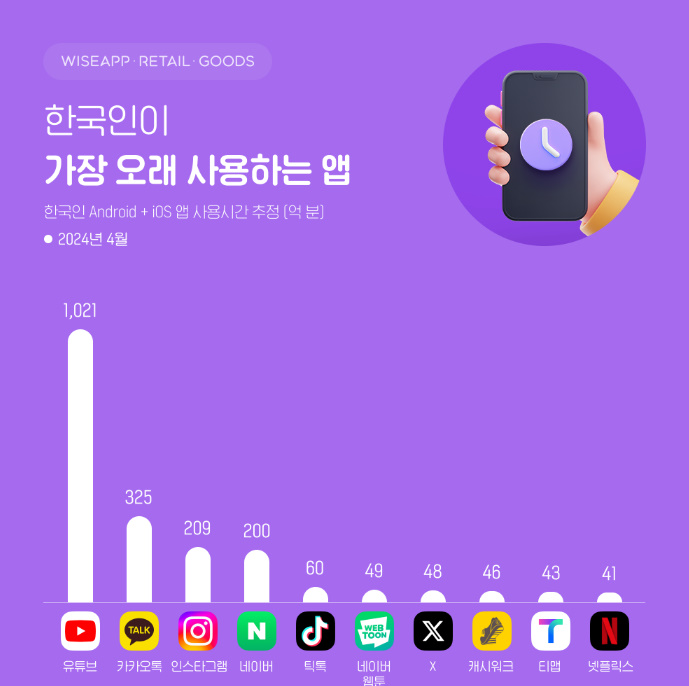 2024년 4월 가장 오래 사용한 앱은 유튜브(1021억분 사용)입니다. 2위-카카오톡(3억25억분) 3위-인스타그램(209억분) 4위- 네이버 (200억분), 틱톡 (60억분), 네이버웹툰 (49억분,) X (48억분), 캐시워크 (46억분), 티맵 (43억분), 넷플릭스 (41억분) 순이었습니다. (와즈앱·리테일·굿즈)