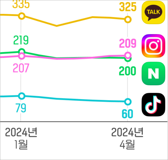 1. 1위- 유튜브 2위-카카오톡 3위-인스타그램 4위-네이버